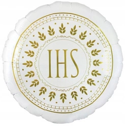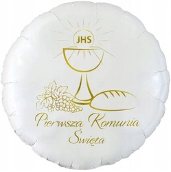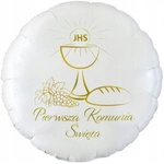 Balon foliowy IHS biały na PIERWSZĄ KOMUNIĘ ŚWIĘTĄ złoty nadruk hostia 46cm
