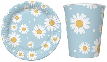 Zestaw Talerzyki Kubeczki Niebieskie Stokrotki na Urodziny Roczek 12szt