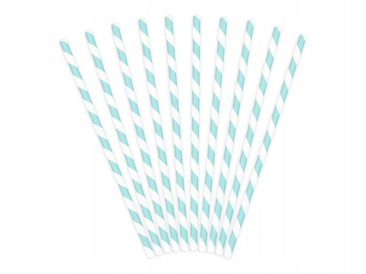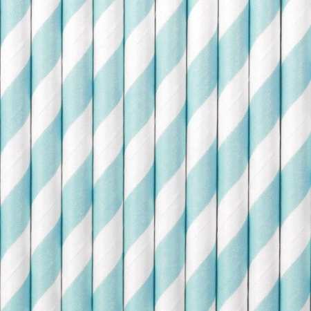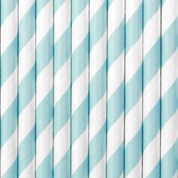 Słomki papierowe w kolorze jasnoniebieskim z białymi ukośnymi paskami