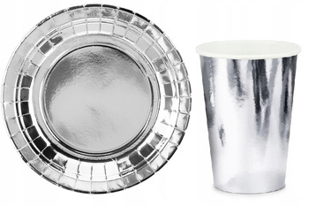 Zestaw SREBRNY Talerzyki Kubeczki urodziny 12szt