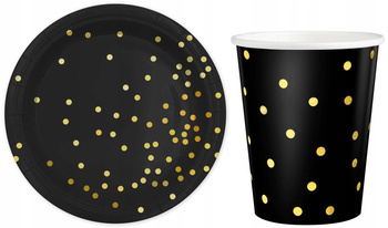 Zestaw CZARNY ZŁOTE KROPKI Talerzyki Kubeczki 12sz