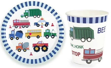 Zestaw talerzyków i kubeczków urodzinowych SAMOCHODY