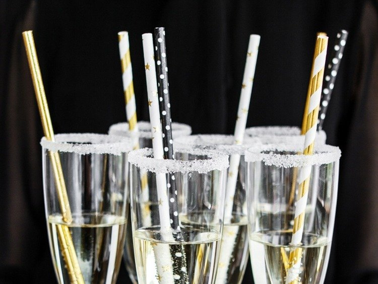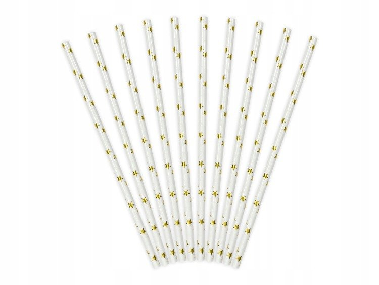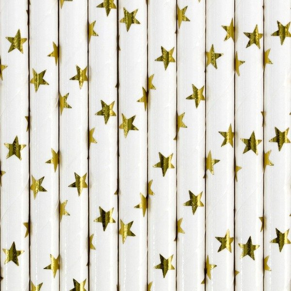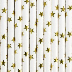 Słomki papierowe w kolorze białym, ze złotymi metalizowanymi gwiazdkami