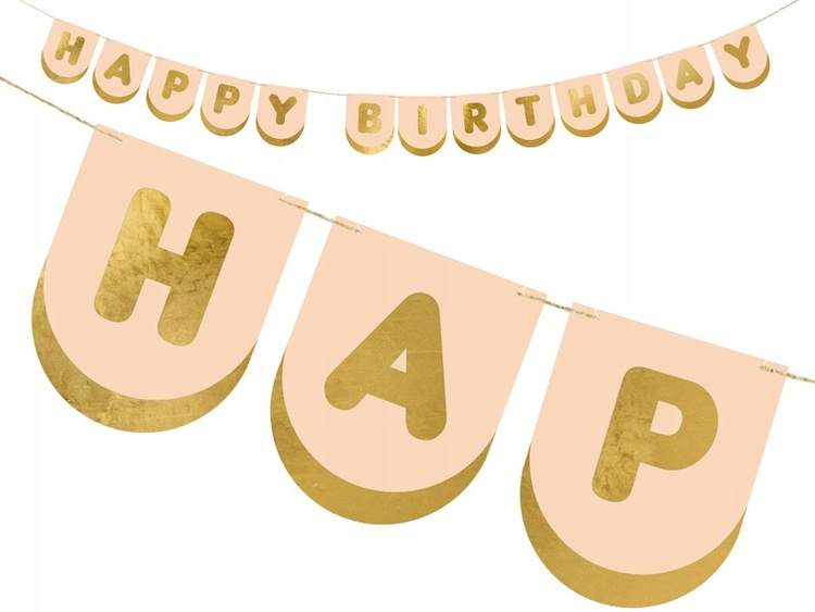 Baner "Happy Birthday" to elegancki element dekoracyjny wykonany z z papieru w kolorze jasnoróżowym ze złotym napisem.