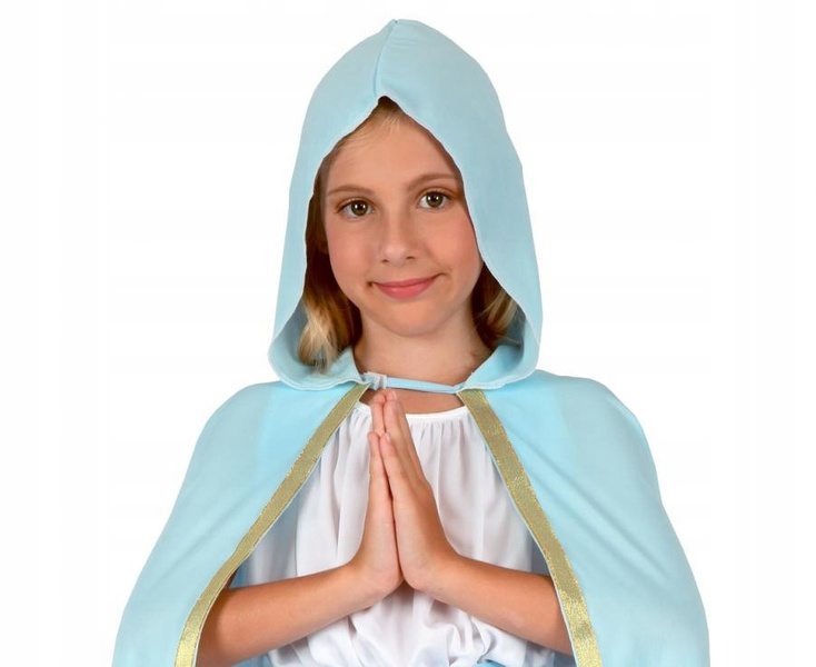 Piękny strój Maryi, zaprojektowany specjalnie dla dzieci biorących udział w jasełkach, teatrzykach i przedstawieniach religijnych. Zestaw składa się z białej sukienki, niebieskiej peleryny z kapturem oraz błękitnego paska, co wiernie odzwierciedla tradycyjny wygląd postaci Maryi.