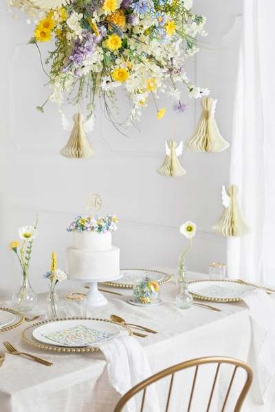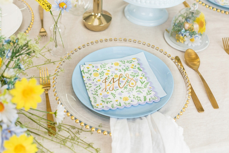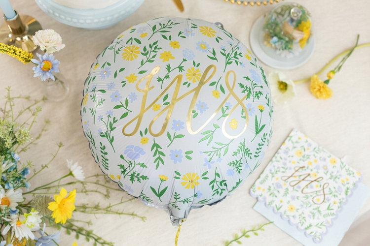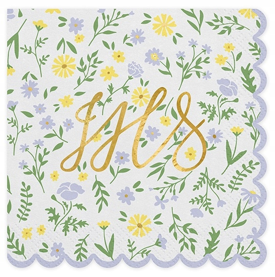 Serwetki papierowe z delikatnym wzorem kolorowych kwiatków i zielonych listków, ozdobione eleganckim złotym napisem IHS, to doskonały wybór na uroczystości Pierwszej Komunii Świętej.
