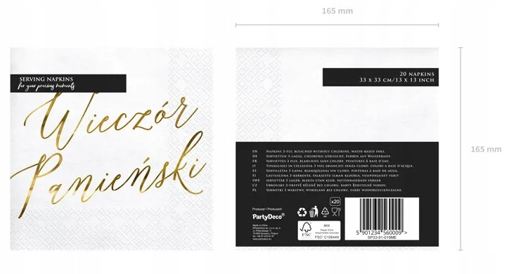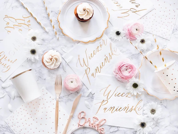 Serwetki papierowe w białym kolorze ze złotym metalizowanym napisem "Wieczór panieński" to elegancki i stylowy dodatek do przyjęcia.