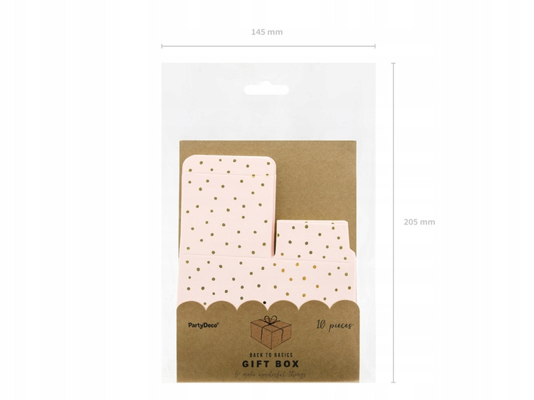 Pudełeczka dla gości to idealny sposób, aby podziękować uczestnikom przyjęcia za ich obecność. Dzięki jasnoróżowemu kolorowi i złotym kropkom, pudełeczka prezentują się niezwykle elegancko i oryginalnie. Wypełnij je cukierkami lub małymi figurkami, aby stworzyć niezapomnianą pamiątkę.