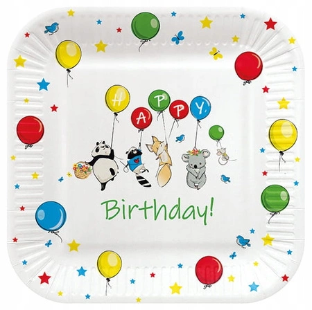 Kwadratowe kolorowe talerzyki papierowe Balloons o wielkości 23 cm to idealna propozycja na dziecięce przyjęcia, urodziny czy pikniki.