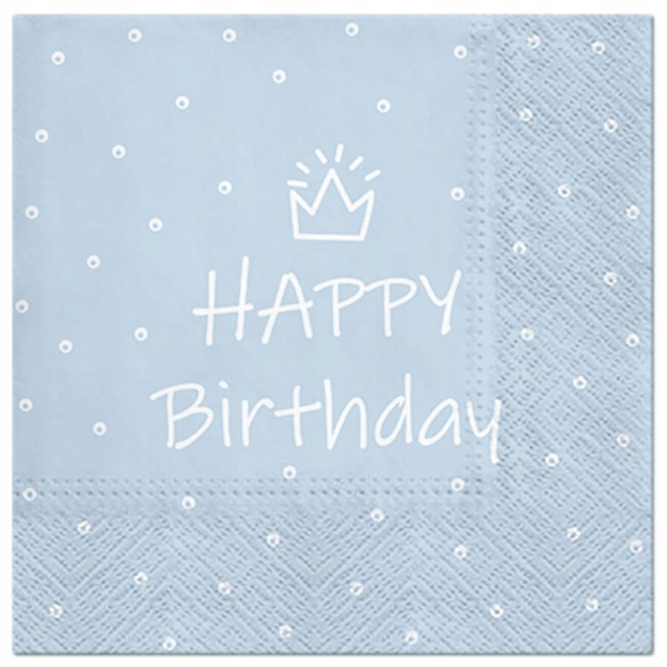 Niebieskie serwetki urodzinowe z napisem „Happy Birthday”, ozdobione delikatną koroną i dekoracyjnymi kropkami, to idealny wybór na wyjątkowe urodziny.