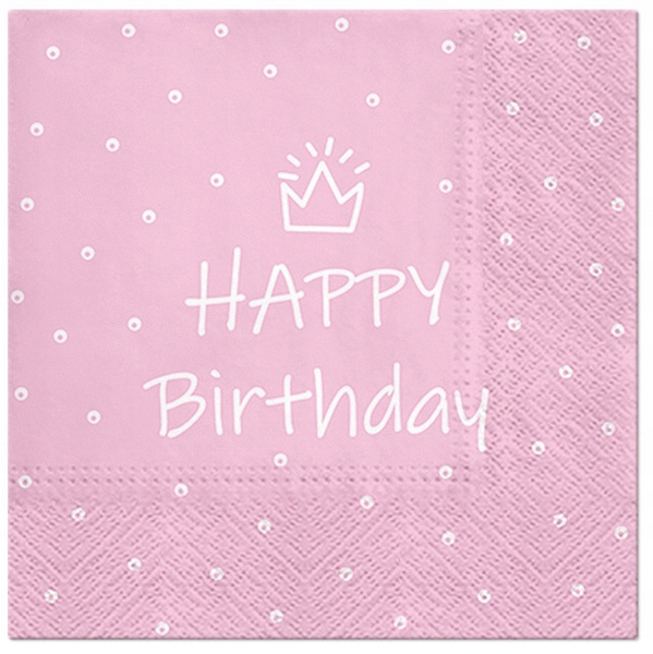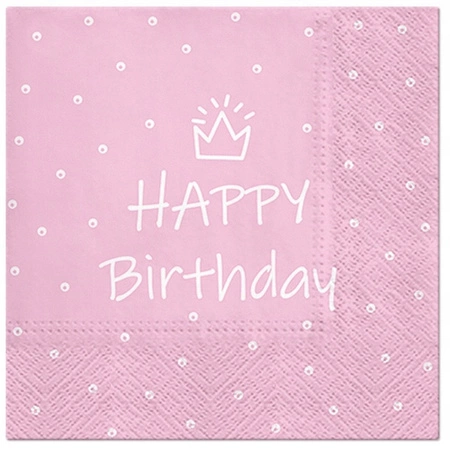 Różowe serwetki urodzinowe z napisem „Happy Birthday”, ozdobione delikatną koroną i dekoracyjnymi kropkami, to idealny wybór na wyjątkowe urodziny.