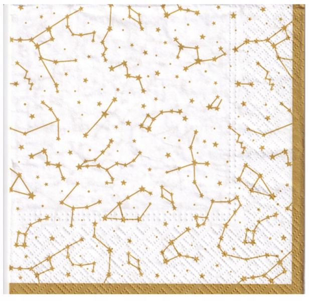 Serwetki papierowe 3-warstwowe w eleganckim, białym kolorze z subtelnym złotym nadrukiem konstelacji znaków zodiaku to wyjątkowy dodatek, który doda magii i niepowtarzalnego klimatu każdemu przyjęciu.