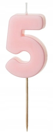 Urocza świeczka w kształcie cyfry 5 w delikatnym, jasnoróżowym kolorze to idealna dekoracja tortu na urodziny dzieci i dorosłych.