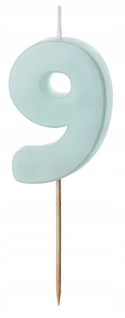 Urocza świeczka w kształcie cyfry 9 w delikatnym, jasnoniebieskim kolorze to idealna dekoracja tortu na urodziny dzieci i dorosłych.