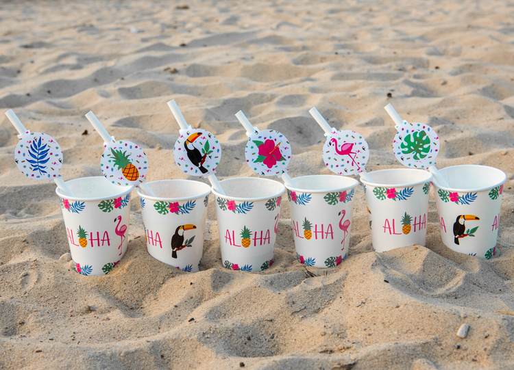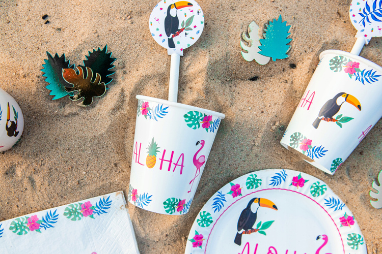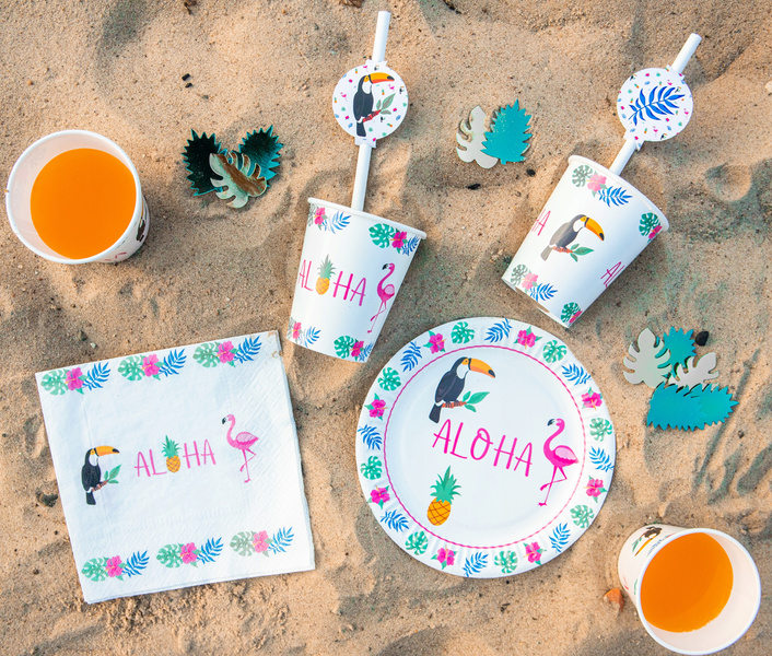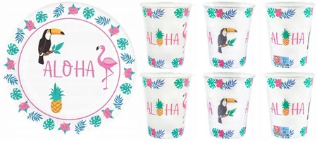 Talerzyki i kubeczki papierowe z zestawu Aloha Party, idealne na urodziny dla dziecka.