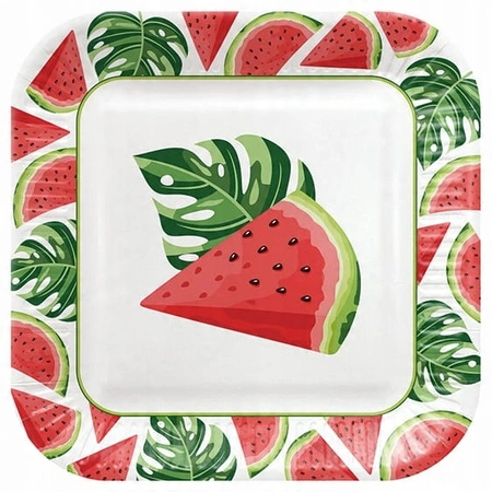 Dodaj świeżości i radości swojemu przyjęciu dzięki kwadratowym talerzykom papierowym z motywem soczystych arbuzów.