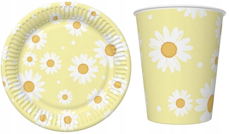Talerzyki i kubeczki papierowe z zestawu Stokrotki, idealne na urodziny dla dziecka.