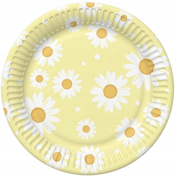 Okrągłe talerzyki o średnicy 18 cm wykonane są z papieru i ozdobione delikatnym nadrukiem białych stokrotek na żółtym tle.