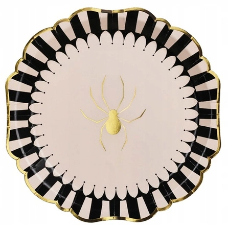 Papierowe talerzyki Halloween z błyszczącym, złotym pająkiem to stylowy i nieco mroczny akcent, który doskonale dopełni dekorację stołu podczas halloweenowego przyjęcia.