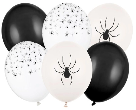 Zestaw zawiera balony w dwóch wariantach: balony z nadrukiem pająków w kolorach Pastel Off-white i Crystal Clear, oraz gładkie balony w głębokim odcieniu Pastel Black, które razem tworzą efektowną i spójną kompozycję.