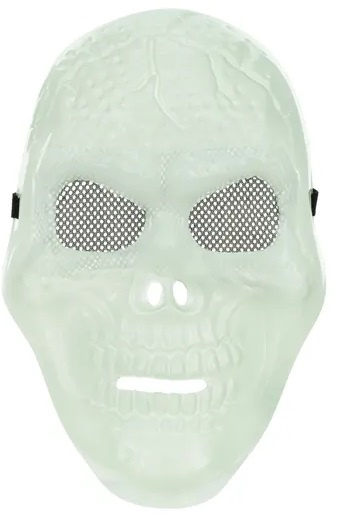 Dzięki specjalnemu materiałowi, maska emituje delikatne światło po uprzednim naświetleniu, tworząc upiorny efekt w ciemnościach.