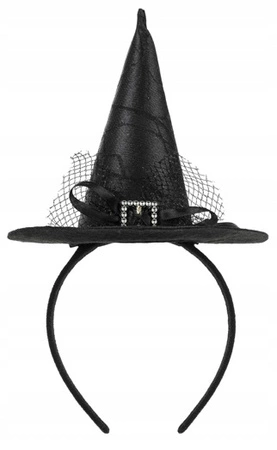 Na czarnej opasce osadzony jest elegancki kapelusz wiedźmy w klasycznym, stożkowym kształcie.