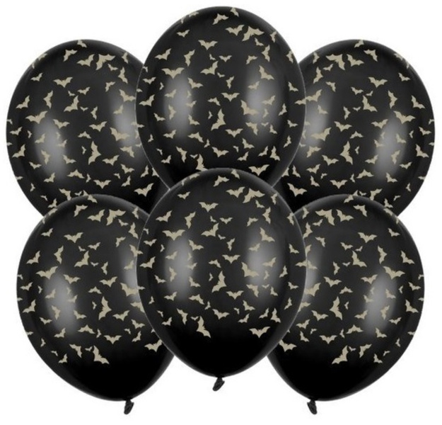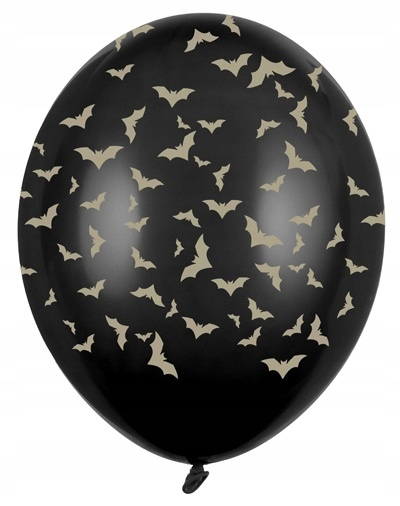 Stwórz mroczną, ale jednocześnie elegancką atmosferę dzięki tym wyjątkowym balonom lateksowym w kolorze głębokiej czerni, ozdobionym złotym nadrukiem nietoperzy na pięciu stronach!
