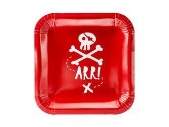 Talerzyki papierowe Piraci w kolorze czerwonym z białym nadrukiem