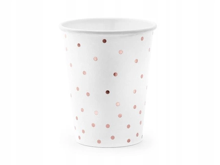 Białe kubeczki papierowe ze wzorem kropek w kolorze różowego złota