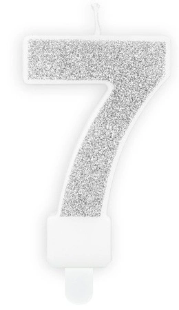 Świeczka urodzinowa Cyferka 7w kolorze srebrnym brokatowymNiezbędna na każdym torcie!Idealna dekoracja tortu na urodzinach.Wysokość: około 7cmCena dotyczy 1 sztuki