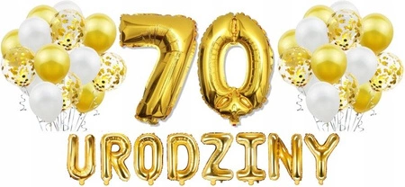 Zestaw ZŁOTY BALONY na 70 URODZINY białe konfetti