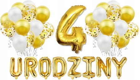 Zestaw ZŁOTY BALONY na 4 URODZINY białe konfetti