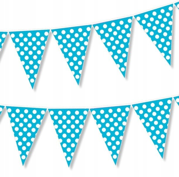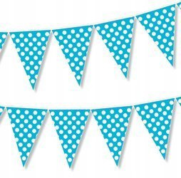 Trójkątne chorągiewki flagi, NIEBIESKIE w białe grochy (nadruk z dwóch stron chorągiewki) i połączone białą materiałową wstążeczką.