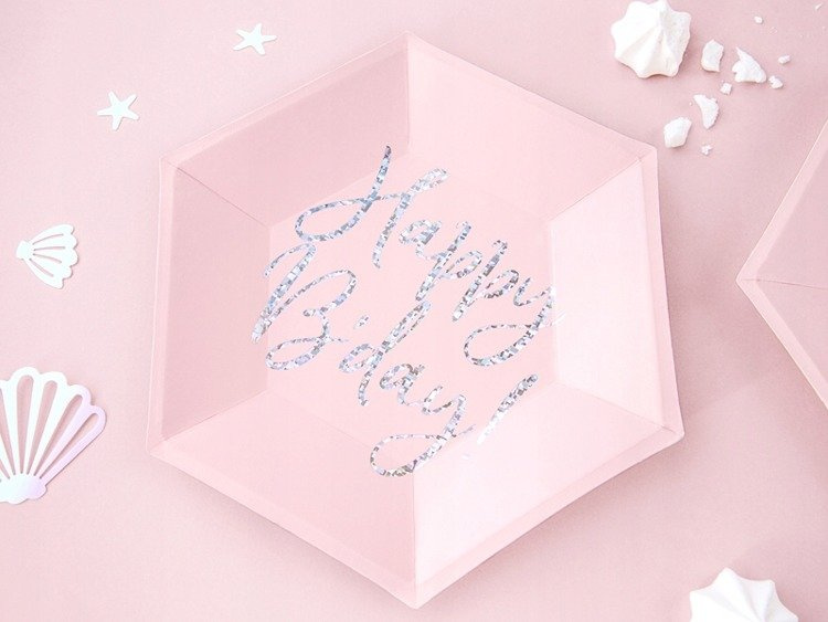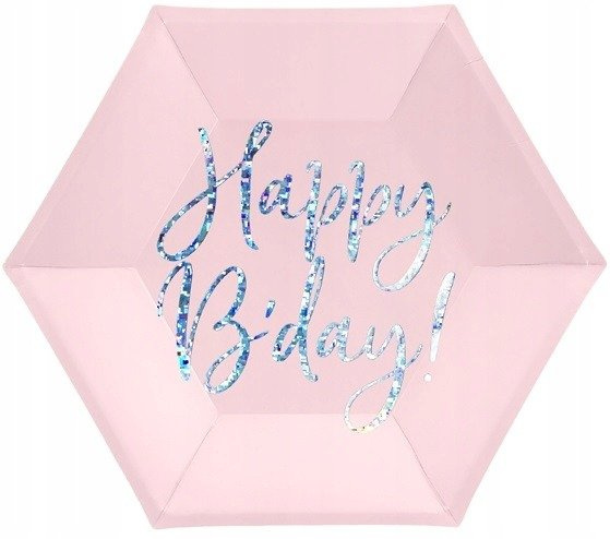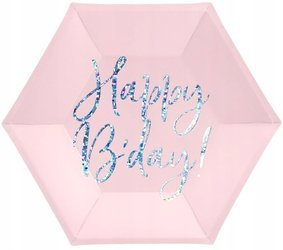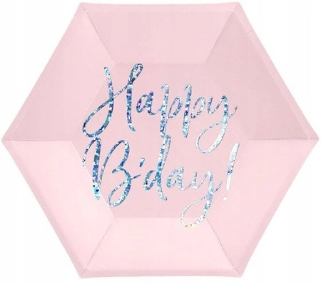 Talerzyki papierowe w kolorze jasnego pudrowego różu z opalizującym napisem Happy B'day!