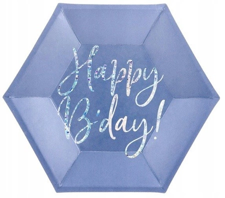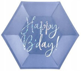Talerzyki papierowe w kolorze granatowym z holograficznym napisem Happy B'day!