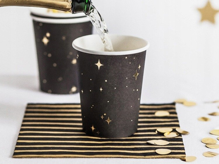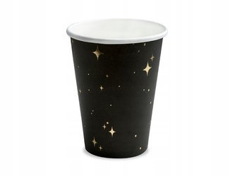 Kubeczki, czarnyKubeczki papierowe w kolorze czarnym ze złotym wzoremPojemność około 260mlZestaw zawiera 6 kubeczków