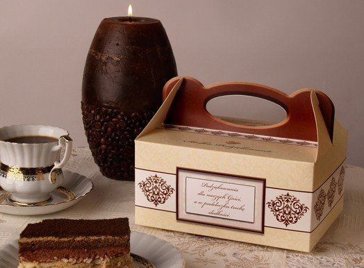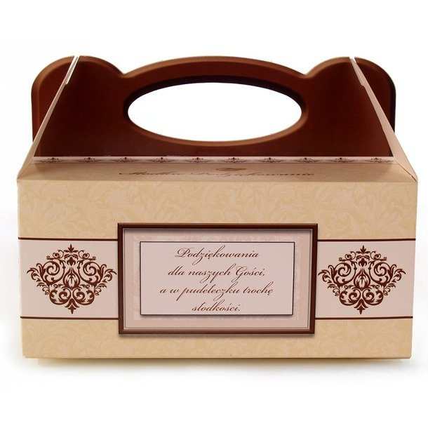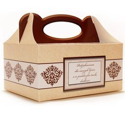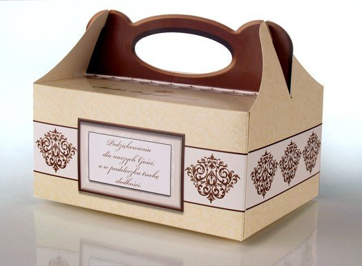 Nowa bardziej elegancka, wygodna i wytrzymała rączka. Pudełko wykonane z tektury o gramaturze 350 g posiadającej atest do kontaktu z żywnością.
