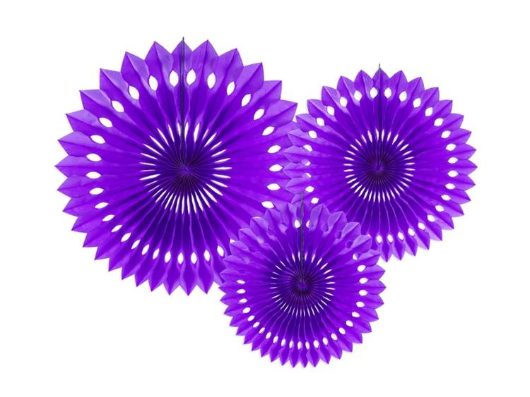 Rozety dekoracyjneWykonane z bibuły w kolorze fioletowym.Średnice po złożeniu:ok. 20 cm, 25 cm i 30 cm.Komplet zawiera 3 sztuki