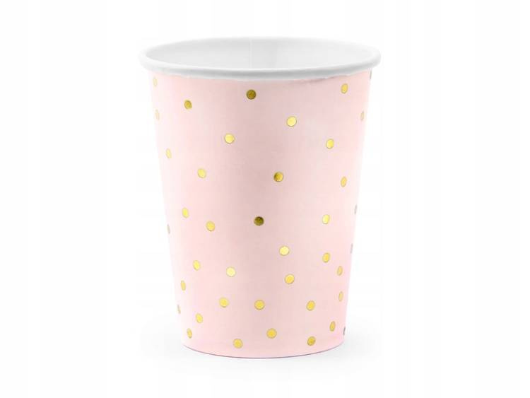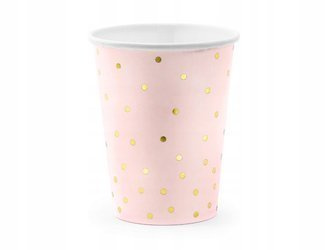 Kubeczki papierowe w kolorze jasnoróżowym ze złotym wzorem kropek.