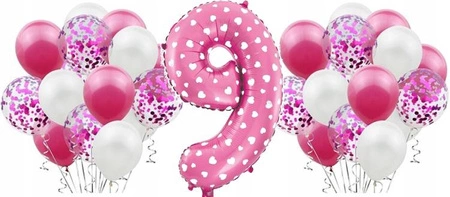 Zestaw RÓŻOWY na 9 URODZINY BALONY biały konfetti