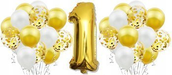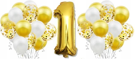 Zestaw ZŁOTE BALONY na 1 URODZINY białe konfetti