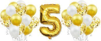 Zestaw ZŁOTE BALONY na 5 URODZINY białe konfetti