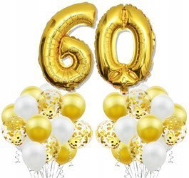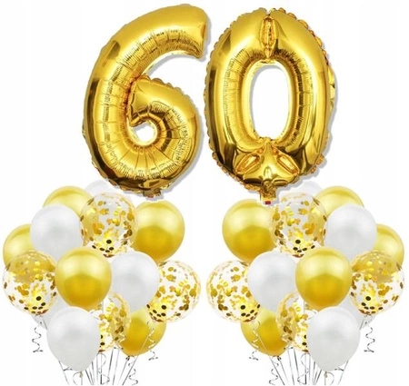 Zestaw ZŁOTE BALONY na 60 URODZINY białe konfetti
