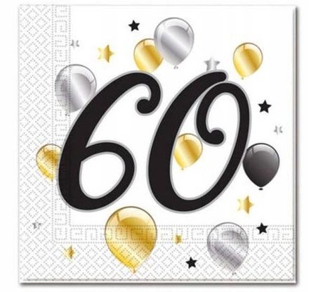 Serwetki papierowe w kolorze białym z nadrukiem liczby "60" w kolorze czarnym oraz złote i srebrne baloniki i gwiazdki.