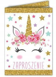 Efektowne, brokatowane zaproszenie na urodziny (róg jednorożca, gwiazdki oraz wybrane elementy są wydrukowane mieniącym się brokatem w kolorze złotym).