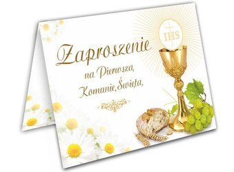 Zaproszenie na uroczystość przyjęcia Sakramentu Pierwszej Komunii Świętej i na Przyjęcie Komunijne. Drukowane techniką offsetową (tekst nie rozmazuje się pod wpływem wilgoci) na półmatowym papierze o gramaturze 300 g. Wykropkowane miejsca o tak dobranej długości, aby zmieścić wszystkie potrzebne informacje.