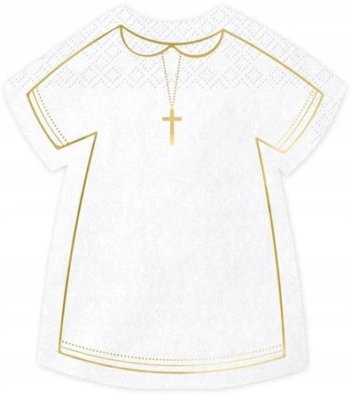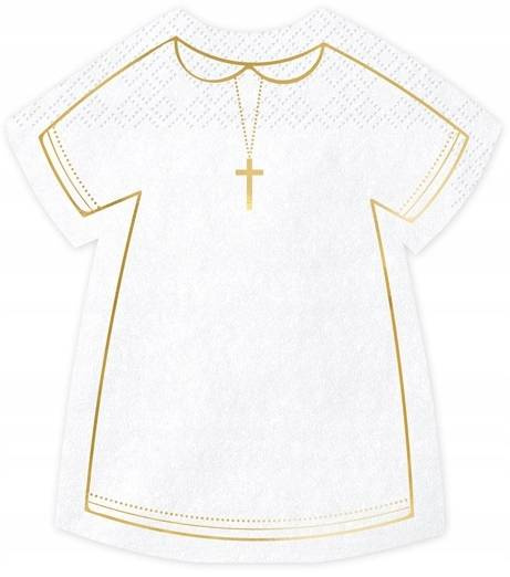 Serwetki papierowe w kształcie alby komunijnej w kolorze białym ze złotym metalizowanym nadrukiem.