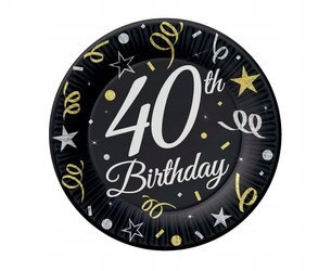 Talerzyki papierowe w kolorze czarnym z białym napisem 40th Birthday!
