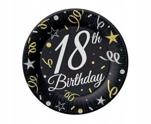 Talerzyki papierowe w kolorze czarnym z białym napisem 18th Birthday!