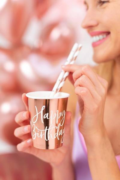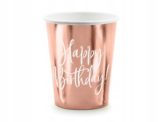 Kubeczki papierowe w kolorze różowego złota z białym napisem Happy Birthday!